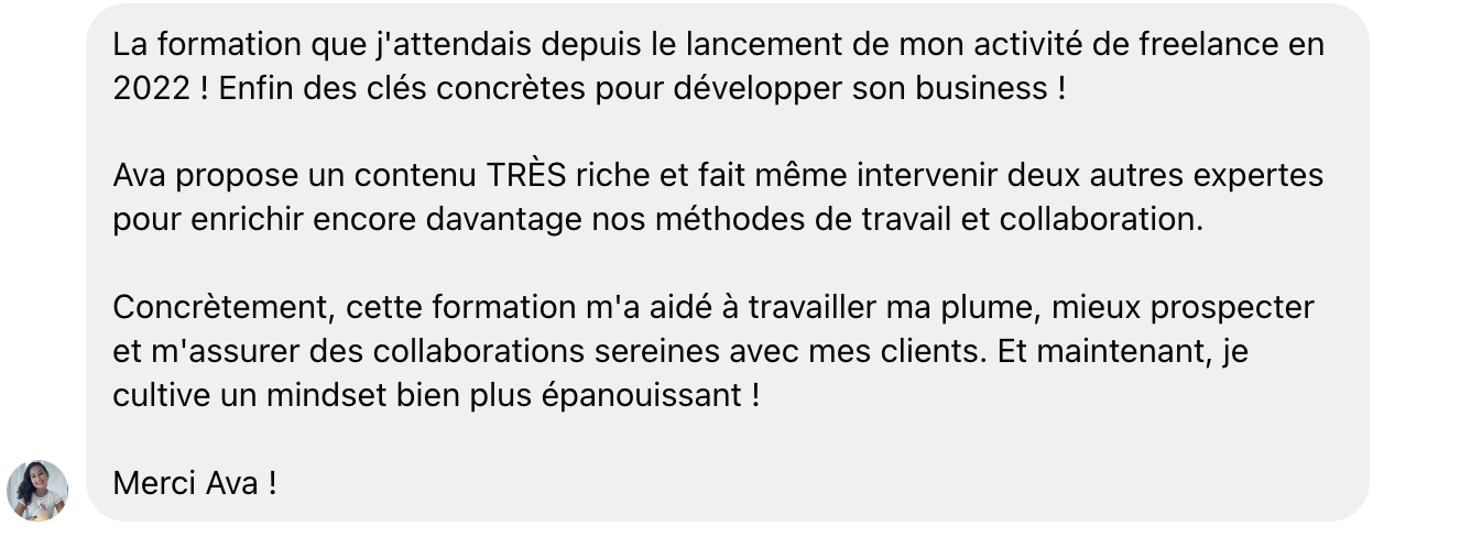 Si tu appliques les conseils et le process délivrés dans la formation, tu apprendras à mieux te démarquer dans ton domaine, tu (re)connaîtras les fondements de la rédaction web sur le bout des doigts, tu réussiras à proposer des contenuswebuniques, tu sauras identifier et solidifier ton réseau, tu pourras cibler ton client idéal, le fidéliser et pérenniser ton business.